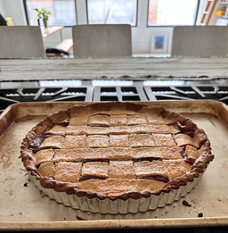 Step 7 Using an offset spatula, spread jam mix evenly over the cooled torte; set aside. Using a fluted pastry wheel, cut 3/4-inch-wide strips from chilled round of dough. Arrange strips on top of jam in a lattice pattern. Brush with heavy cream and sprinkle turbinado sugar on top. Freeze until firm, about 30 minutes. Meanwhile, preheat oven to 350 degrees.