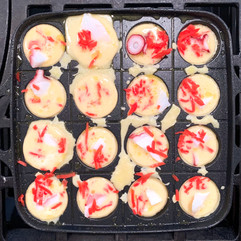 Heat the takoyaki pan to 400ºF (200ºC) over medium heat. Using a brush, generously oil the pan's rounded chambers and flat surface on top. When you see smoke rising from the pan, pour the batter to fill the chambers. It’s okay to slightly overfill the cavities with the batter. In the next steps, the batter will likely overflow as you add more ingredients to it.